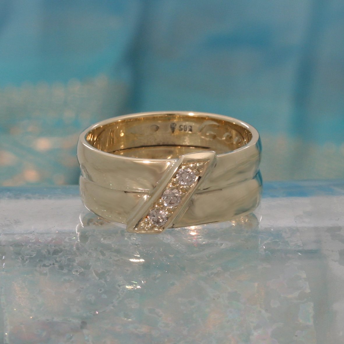 Twee trouwringen samengevoegd met drie briljanten symbool voor de kinderen.