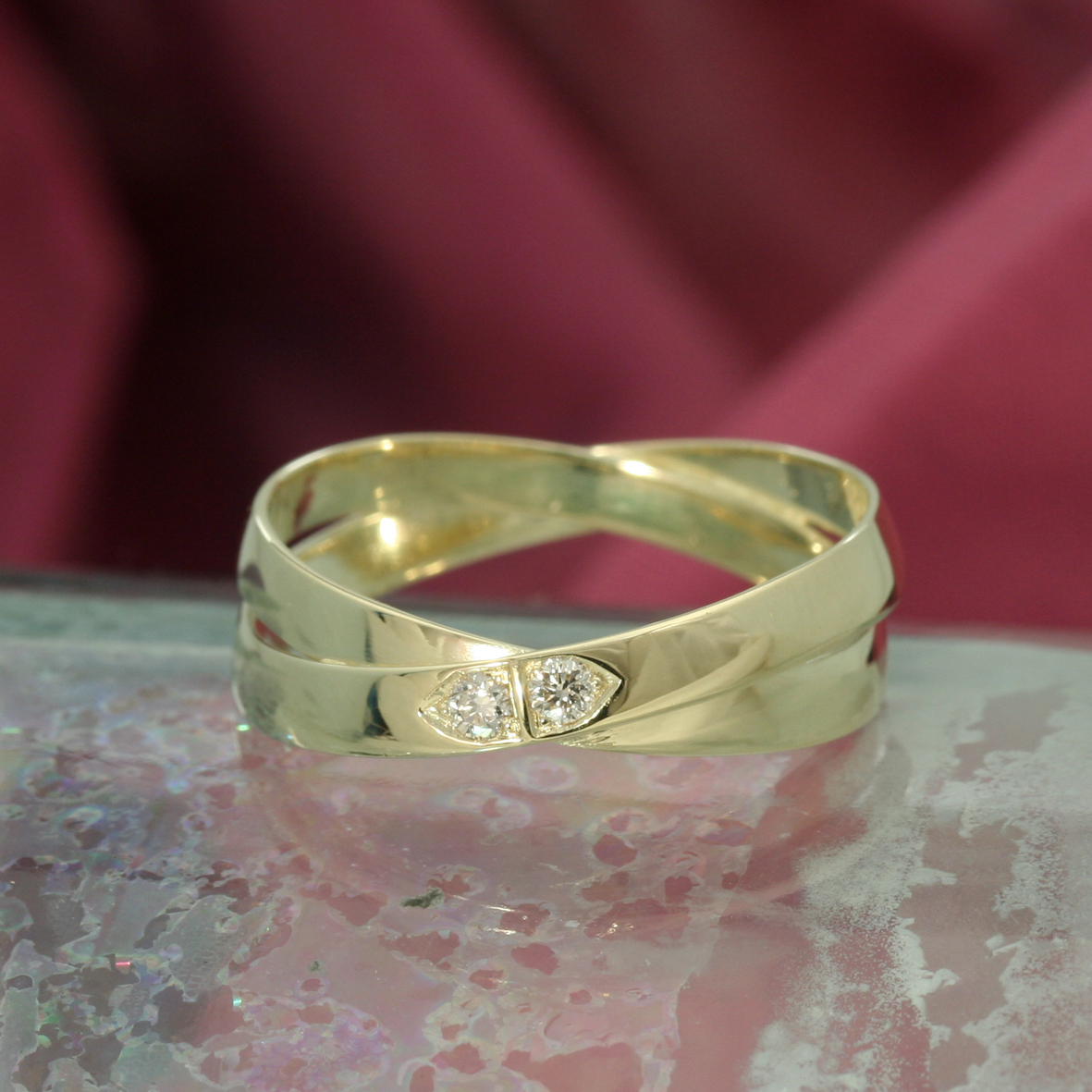 Een ijsmatte gegolfde ring met hieromheen draden getrokken van twee trouwringen en een briljant die oorspronkelijk in een dasspeld zat.