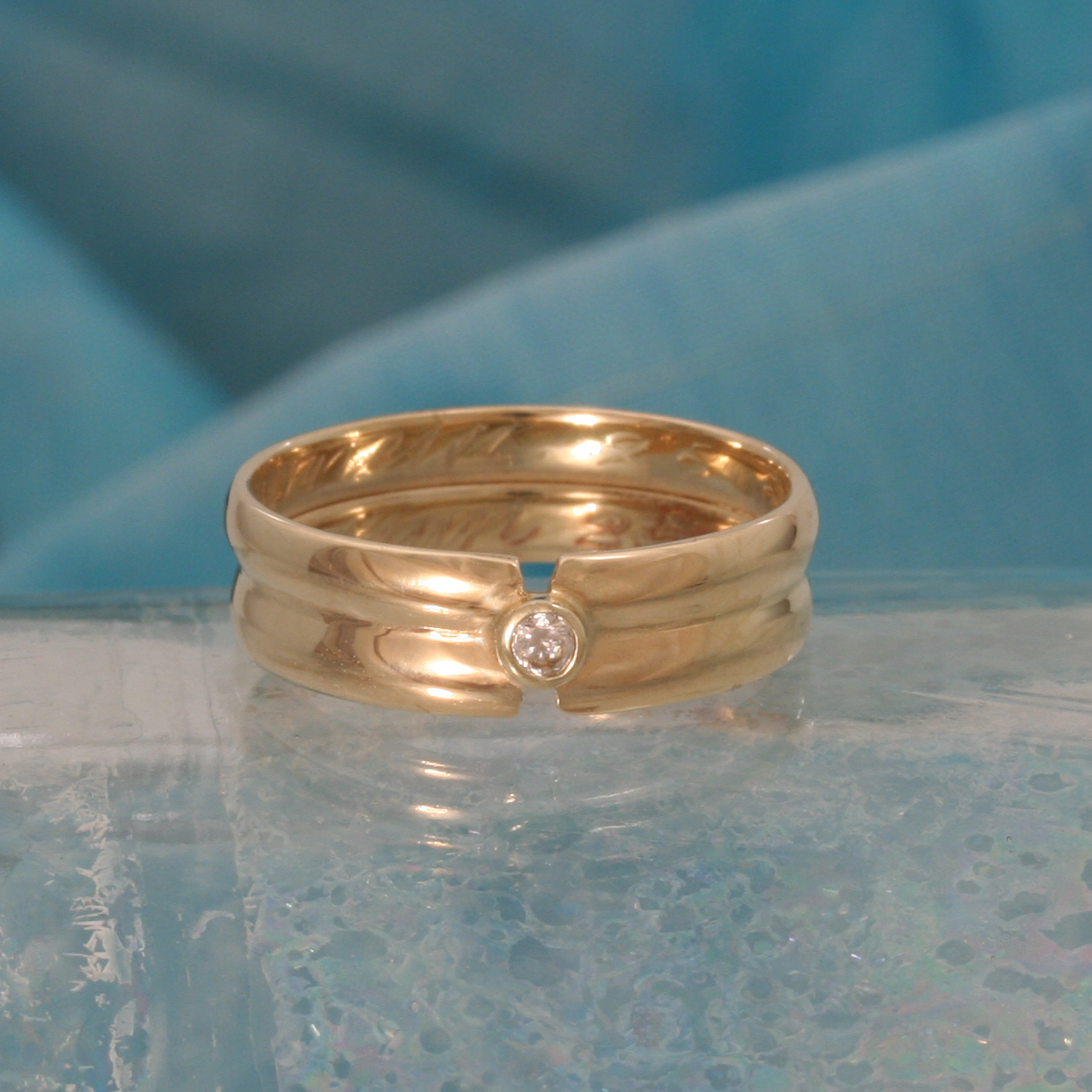 Twee trouwringen samengevoegd. Met een briljant van 0.05 crt.