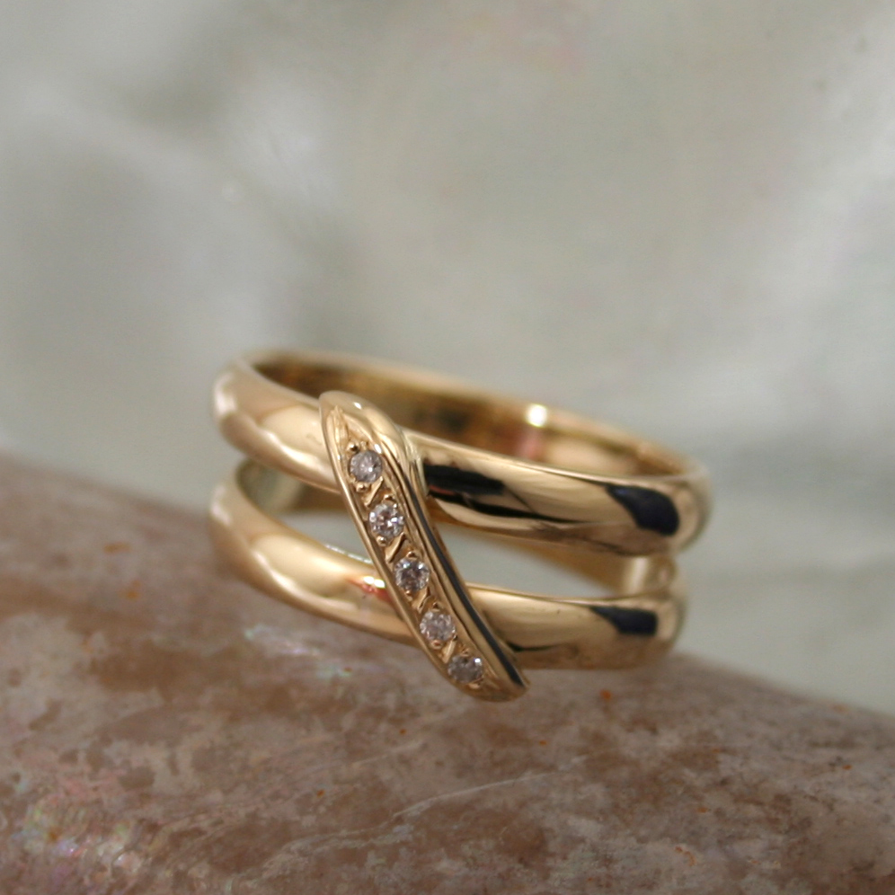 Een ring gemaakt van twee trouwringen met 5 briljanten.