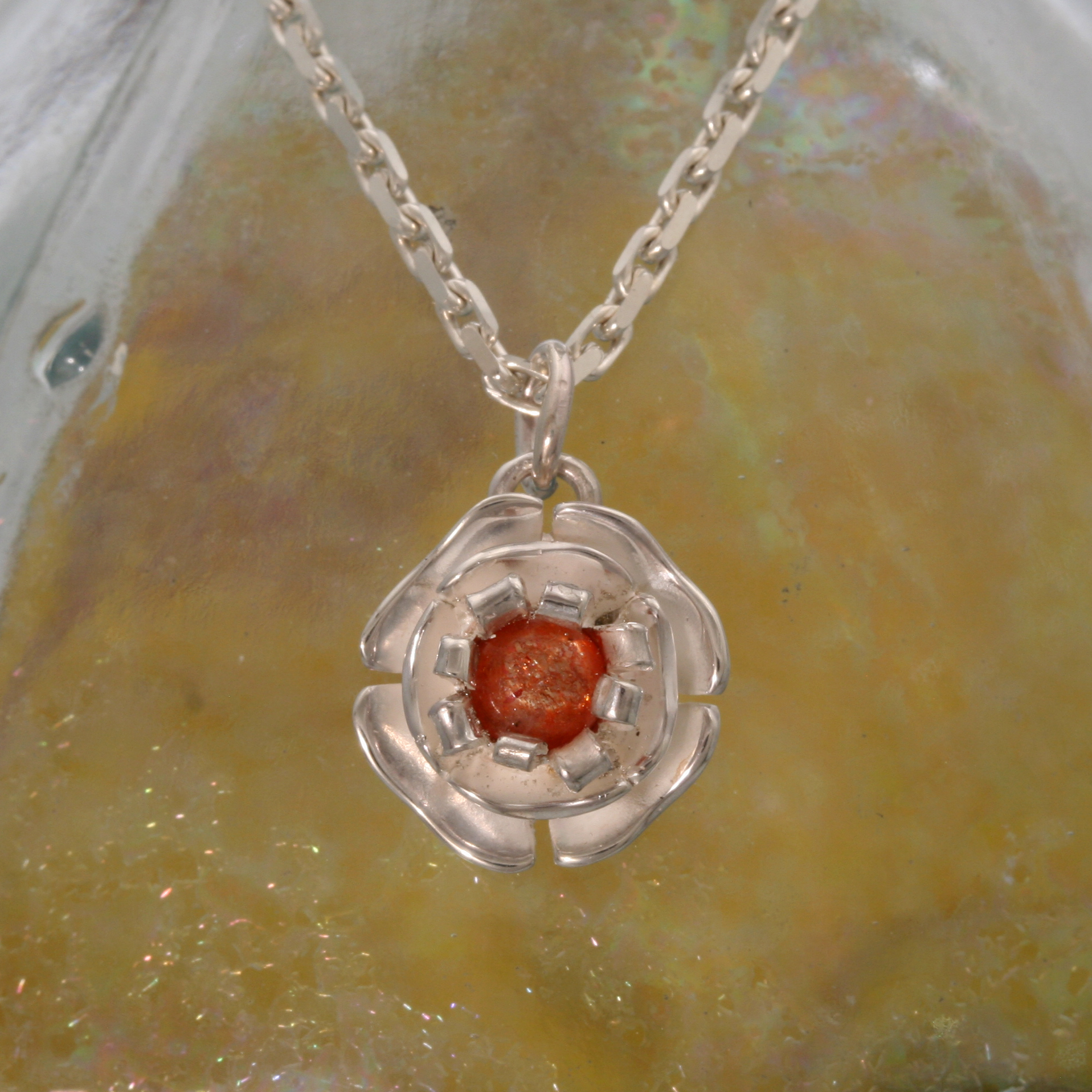 Bloempje Een zilveren hanger, 14 mm doorsnede. Prijs € 165,-
