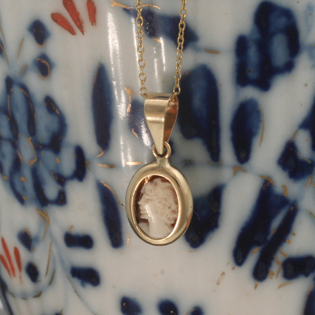 Een geelgouden hangertje met een schelp camee. de zetting is 8 x 10 mm. Prijs € 205,-