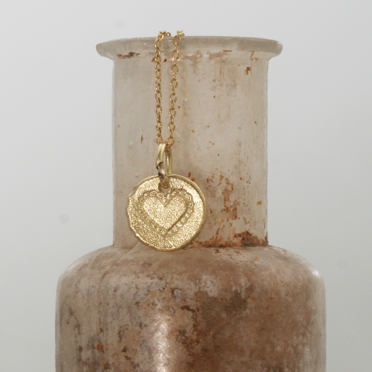 Een mat geelgouden hangertje met een hartje. Doorsnede 8 mm. Prijs € 190,-