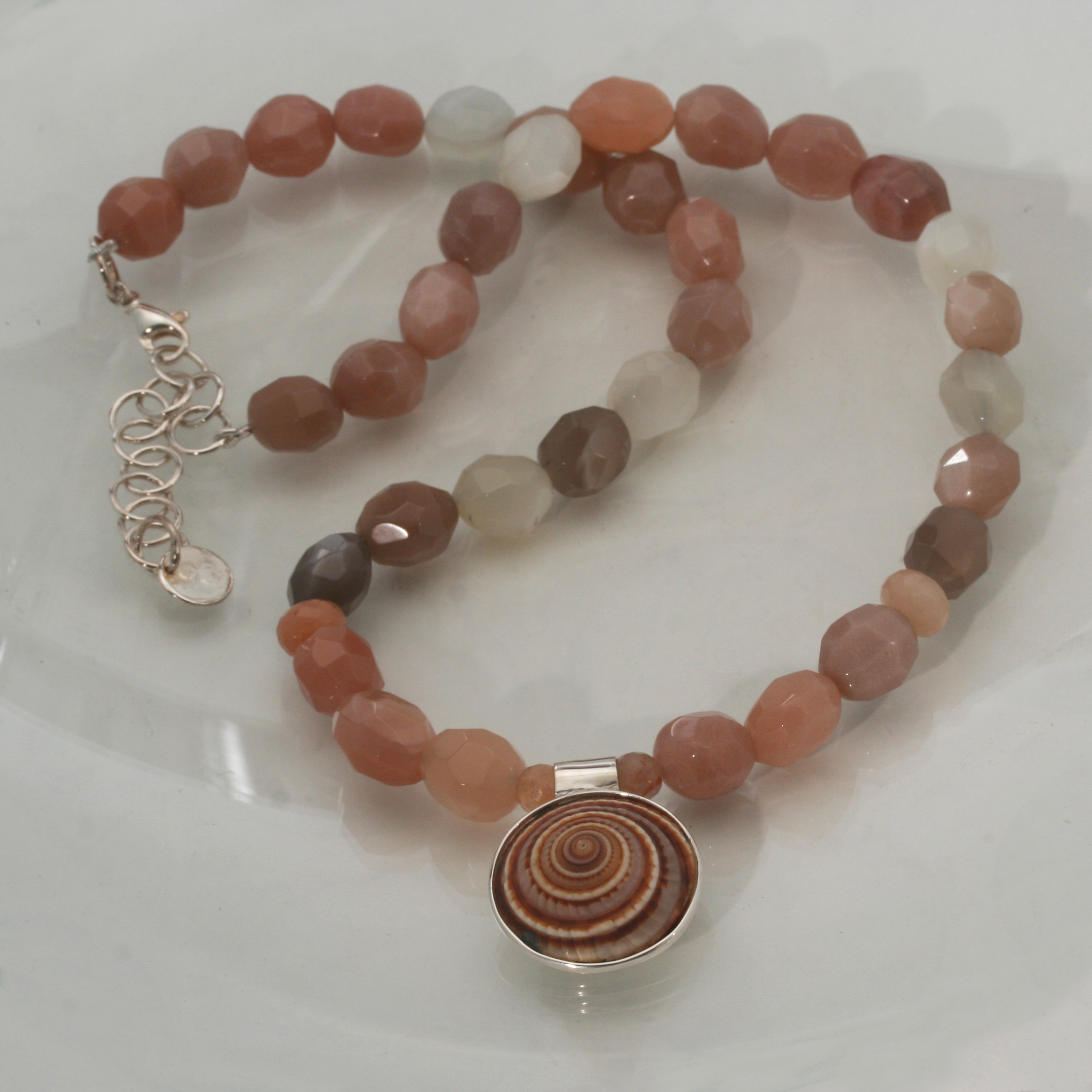 Zilveren hanger/collier met een Japanse oesterschelp. Het collier compleet met ankercollier is 46 cm lang. Prijs: €320,-