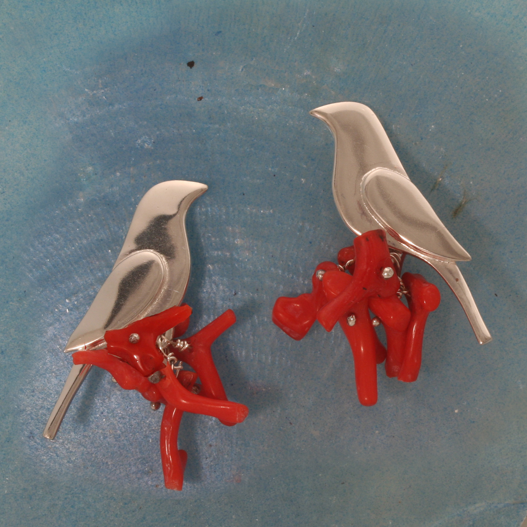 Voorjaarsvogels. Zilveren oorbellen met bloedkoraal. De bloedkoraal is pre loved. € 240,-