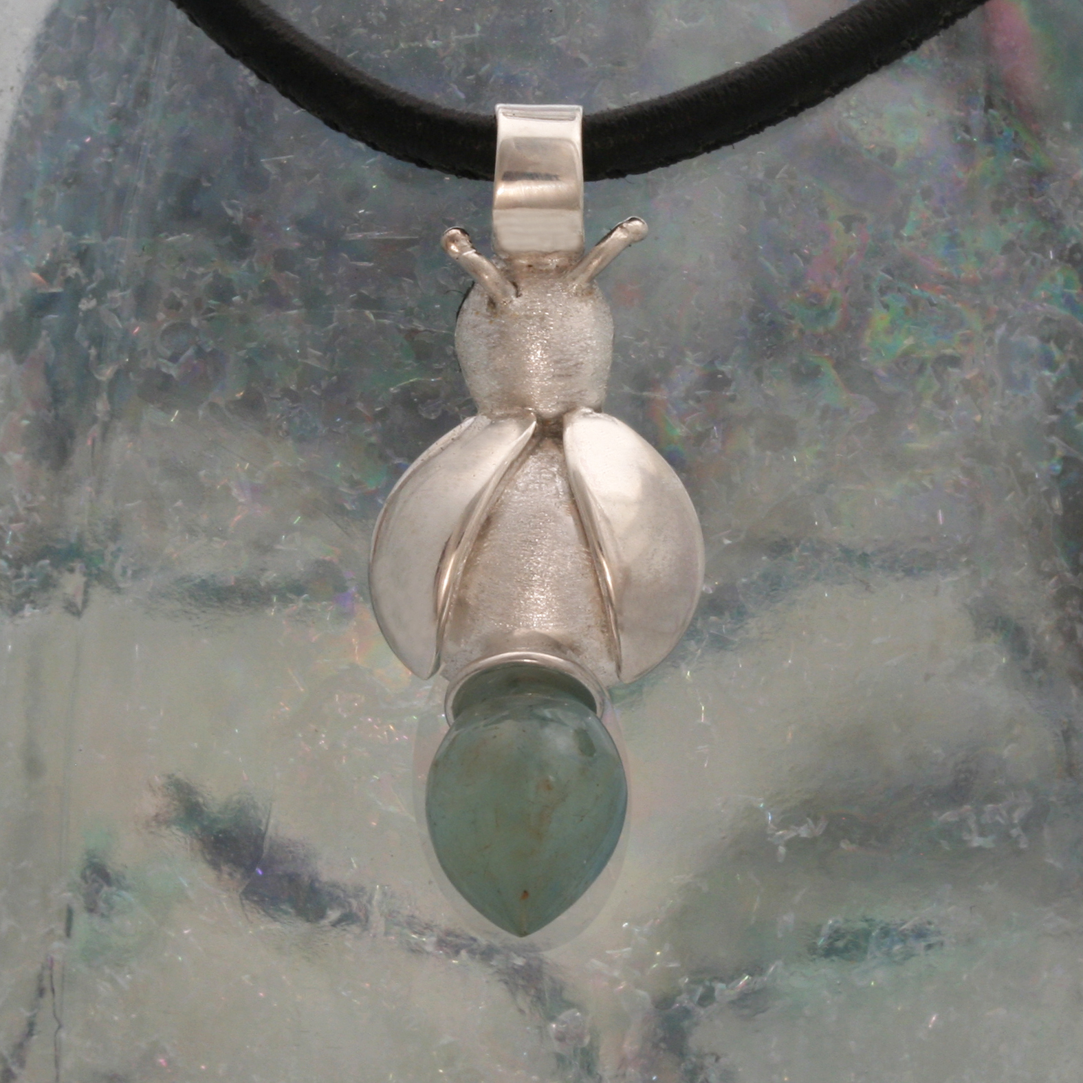 De malachiet-kever is een echt Afrikaans insect. Het houdt van zon en warmte. Soms komt hij voor in Nederland, dan heeft hij zich in een koffer verstopt. De hanger is gemaakt van zilver, malachiet en maansteen. Lengte 26 mm